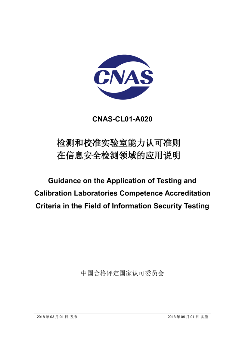 CNAS-CL01-A020:2018《检测和校准实验室能力认可准则在信息安全检测领域的应用说明》